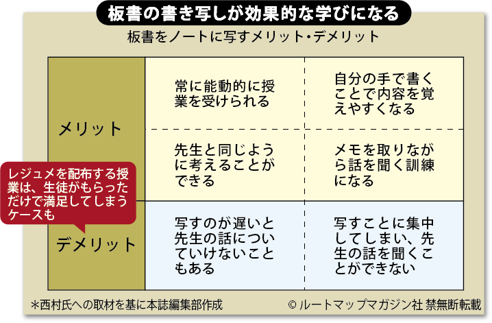 生徒にとっては、ノートを取りながら書いた板書を何度も見直すことで、頭の中の整理、定着にもつながります。ノートを見返す段階で線を引いたり、先生が授業中に話していた雑談などをちょこっと隅に書いたりするのも有効でしょう。この情報がきっかけで、さらに記憶が定着しやすくなります。